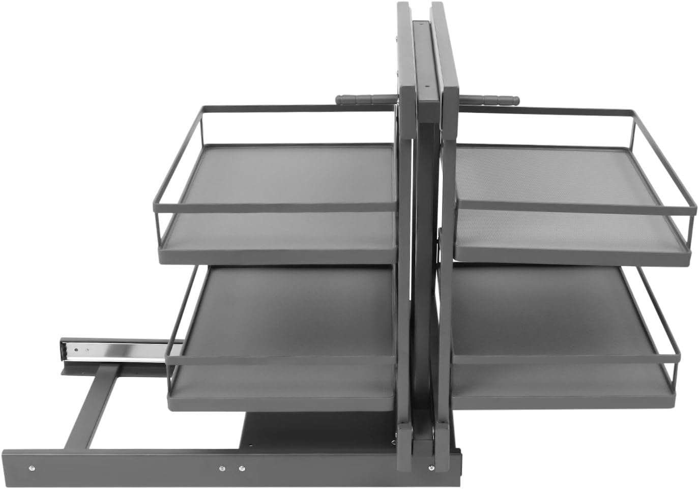Product DescriptionSpecificationColor: Dark GreyMaterial: Carbon SteelProcess: Spray CoatingAssembly Required: YesInstallation Type: Cabinet MountNumber of Compartments: 4Overall Max. Load Capacity: About 30kg/66.14 lbsApplicable Cabinet Inner Width: ≥ 65cm/25.59inApplicable Cabinet Inner Depth: ≥ 53cm/20.87inApplicable Cabinet Door Opening Height: ≥ 60cm/23.62inApplicable Cabinet Door Opening Width: ≥41cm/16.14inEach Tier Size: 42*28.5*8cm/16.54*11.22*3.15inProduct Size: 68*50*59cm/26.77*19.69*23.23inPackage Size: 63*47*33cm/24.8*18.5*12.99inGross Weight: 25kg/55.12lbsNet Weight: 23.75kg/52.36 lbsKey FeaturesPremium Material: It is made of excellent carbon steel material, with a spray coating process, which is sturdy, rust-resistant, wear-resistant, and not easy to deform, ensuring a long service life.Extended Storage Space: This premium product features four spacious storage compartments, designed to fully optimize both horizontal and vertical cabinet space.Robust Design: Crafted from excellent carbon steel and engineered with a smart, stable structure, this product effortlessly supports up to 66.14 lbs. Ideal for storing various kitchen essentials, it ensures both durability and reliability, meeting your weight capacity needs.Effortlessly Smooth and Versatile: This product has got this smooth damping and buffer slide rail thing going on, making glide super silky and easy – efficiently upping your user game. Whether your cabinet door opens left or right, just install the base in the right direction, and you're golden.Maximize Kitchen Space: This innovative product transforms unused corner areas and vertical spaces in your kitchen cabinets, allowing you to store more kitchen essentials and optimize the space of your kitchen cabinet. Say goodbye to clutter and hello to a more organized and efficient kitchen!Guardrails: Each tier of the product adopts a guardrail design, which can better protect your kitchen supplies from falling.Ergonomic Handles: Designed for your convenience, these handles make it effortless to push and pull, enhancing your overall experience with the product.Non-skid Pads: They can ensure your seasoning bottles and pots stay firmly in place, even when pushed or pulled, preventing accidental slips and keeping your kitchen organized and mess-free!Package Included1* Cabinet Pull-out Storage Rack1* English DiagramOther Accessories for Assembly