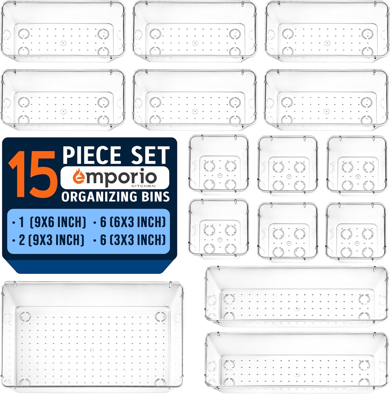 Transform cluttered drawers into neatly organized spaces with the Emporio Kitchen Clear Plastic Drawer Organizers Set. This versatile set is ideal for makeup, bathroom essentials, kitchen gadgets, utensils, office supplies, and more, ensuring everything has its place and is easy to find. The set includes 72 storage bins in four different sizes: twelve pieces (9x6 inches), twenty pieces (9x3 inches), eighteen pieces (6x3 inches), and twenty-two pieces (3x3 inches). These varying sizes allow you to create customized drawer arrangements that fit your specific items perfectly, providing a tailored solution for your organizational needs. Each organizer comes with 288 durable silicone pads that provide a non-slip grip, ensuring the bins stay securely in place. Simply stick them on the bottom of the plastic organizers, and your items will remain neatly arranged without shifting or sliding, even when opening and closing drawers. This non-slip design adds an extra layer of stability, making sure your drawers stay tidy and organized. Designed with efficiency in mind, these bins are stackable, helping you maximize storage capacity in any drawer or on countertops. The stackable feature allows for flexible organization, letting you keep your space clutter-free and well-ordered. Whether you’re storing cosmetics in the bathroom, tools in the kitchen, or stationery in the office, these bins adapt to your needs. Crafted from clear plastic, these organizers are not only durable but also easy to clean. A simple wipe-down with a damp cloth is all it takes to maintain their pristine appearance. The clear design also makes it easy to see and access your items quickly, adding both functionality and convenience to your home organization efforts. Elevate your organizational game with the Emporio Kitchen Drawer Organizers Set, and enjoy a tidier, more efficient living space.