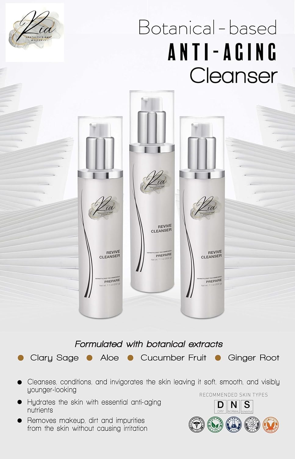 Formulated with botanical extracts from Clary Sage Aloe Cucumber Fruit Ginger Root Cleanses, conditions, and invigorates the skin leaving it soft, smooth, and visibly younger-looking Hydrates the skin with essential anti-aging nutrients Removes makeup, dirt and impurities from the skin without causing irritation