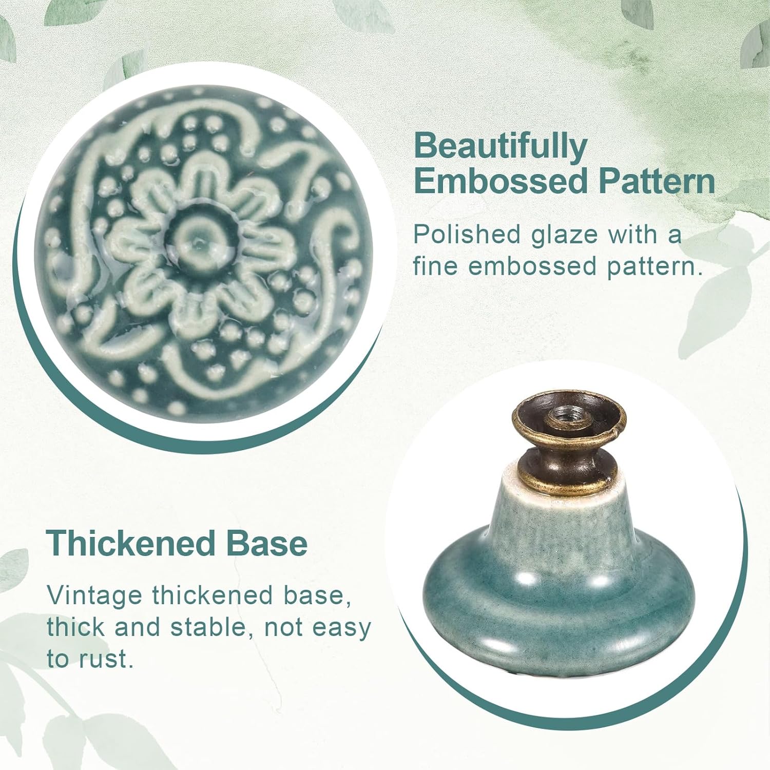 Product Features:1, Chest of drawers knobs, sturdy and durable, not easy to fade, wear-resistant.2, Ceramic drawer knobs are exquisite workmanship, the surface has relief flowers, elegant and retro, can match the furniture well.Product Specification:Quantity: 8 piecesColour: greenSize: 3.4cm/1.3in*3.2cm/1.2in*1.4cm/0.6inMaterial: ceramic + zinc alloyAttention:Manual measurement, slight error in size.Due to the different screens, the colour may be slightly different.